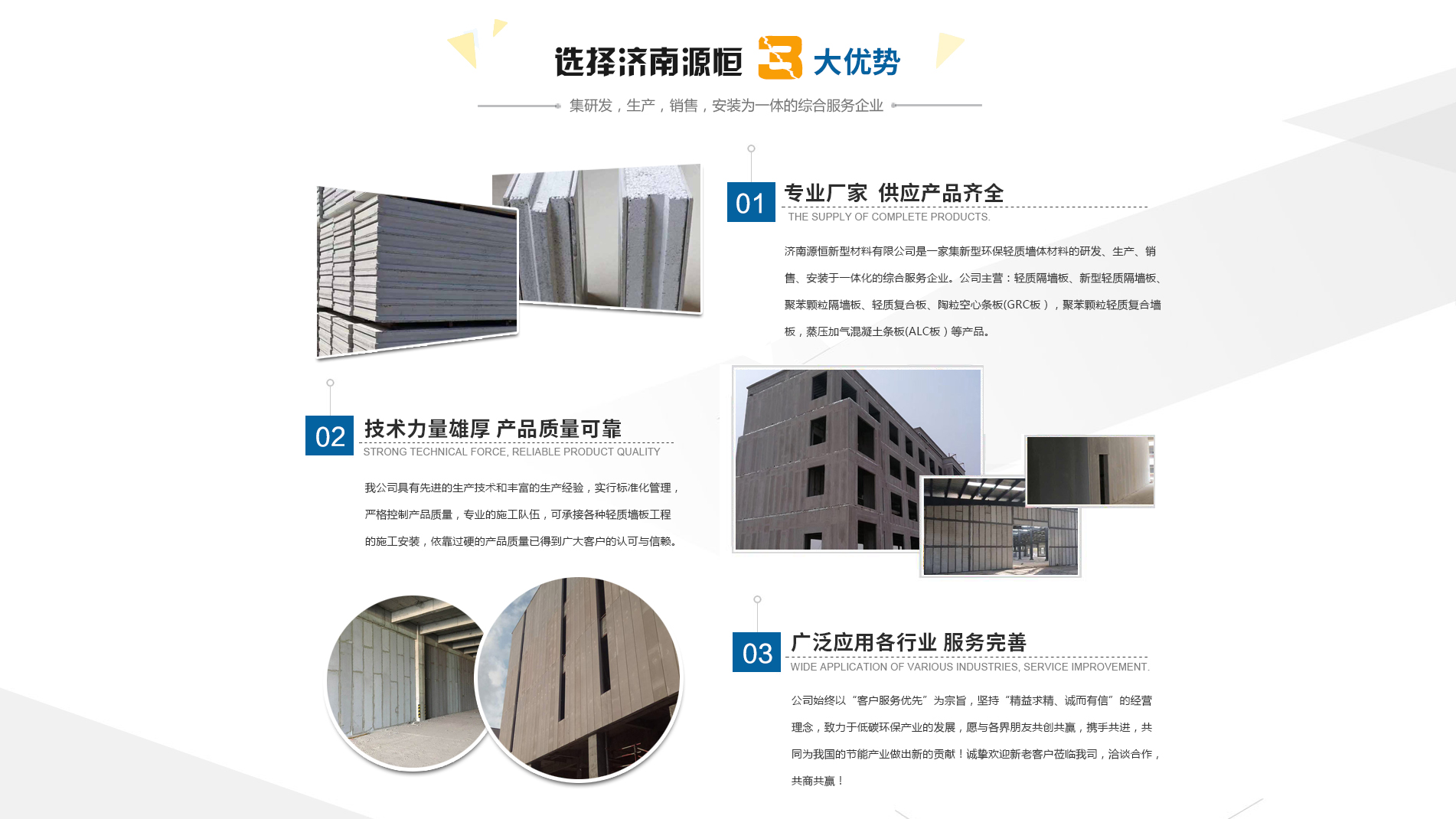 濟南源恒新型材料有限公司坐落于美麗的泉城濟南,是集新型環(huán)保輕質(zhì)墻體材料的研發(fā)、生產(chǎn)、銷售、安裝于一體化的綜合服務(wù)企業(yè)。我公司具有的生產(chǎn)技術(shù)和豐富的生產(chǎn)經(jīng)驗,為您提供輕質(zhì)隔墻板、新型輕質(zhì)隔墻板、聚苯顆粒隔墻板、輕質(zhì)復(fù)合板、陶粒空心條板(GRC板),聚苯顆粒輕質(zhì)復(fù)合墻板,蒸壓加氣混凝土條板(ALC板)等產(chǎn)品,本公司有專的施工隊伍,可承接各種輕質(zhì)墻板工程的施工安裝。輕質(zhì)隔墻板是國家推廣使用的新型輕質(zhì)、綠色無害建材,是墻改節(jié)能政策大力扶持的環(huán)保節(jié)能產(chǎn)品,是發(fā)達國家普遍采用的新型墻體材料。濟南源恒新型材料有限公司實行標(biāo)準(zhǔn)化管理,嚴(yán)格控制產(chǎn)品質(zhì)量,依靠過硬的產(chǎn)品質(zhì)量已得到廣大客戶的認(rèn)可與信賴。公司產(chǎn)品遍布各大城市,與國內(nèi)多家客戶建立了良好的合作關(guān)系。公司始終以“客戶服務(wù)優(yōu)先”為宗旨,堅持“精益求精、誠而有信”的經(jīng)營理念,致力于低碳環(huán)保產(chǎn)業(yè)的發(fā)展,愿與各界朋友共創(chuàng)共贏,攜手共進,共同為我國的節(jié)能產(chǎn)業(yè)做出新的...